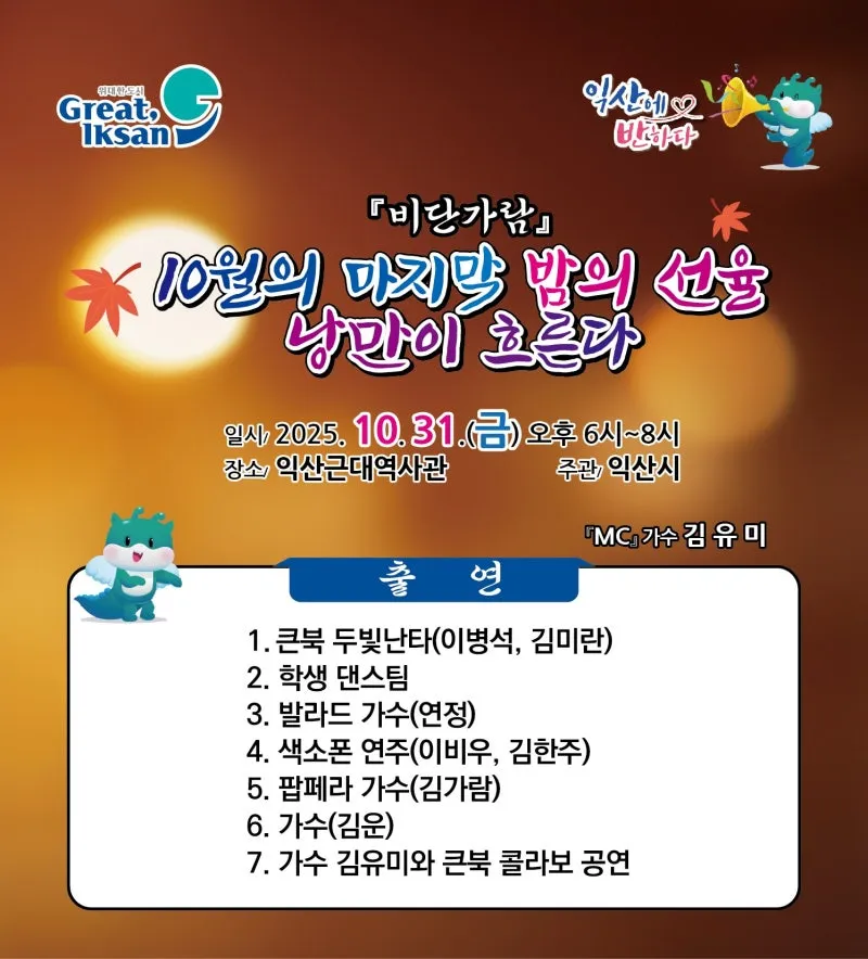 익산의 가을밤, 감성과 선율이 어우러지는 특별한 공연 **「비단가람」**이 열립니다✨