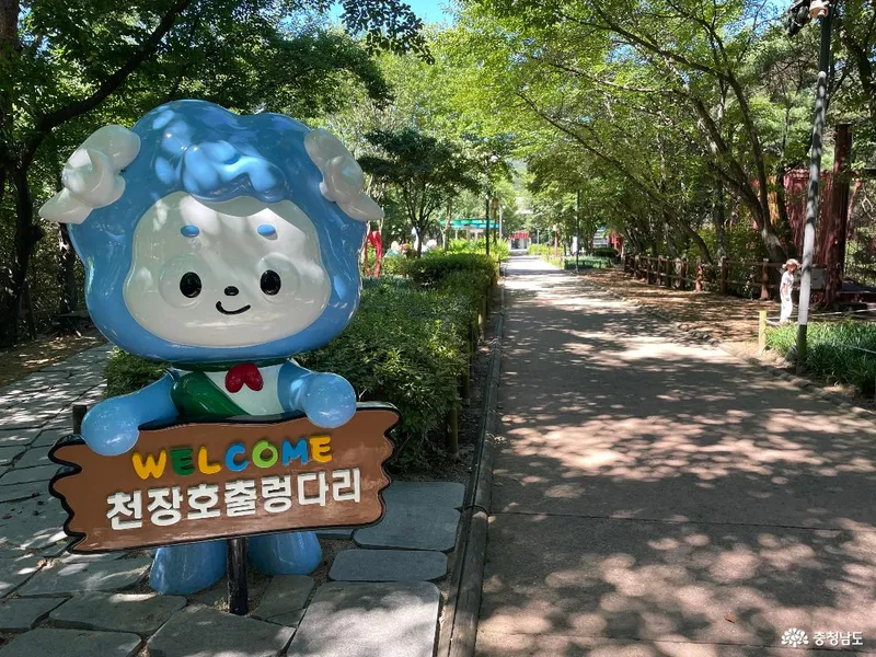 조금만 더 걸어가면 천장호출렁다리를 만날수 있었습니다. 며칠 전에 폭우로 인하여 물이 수위 근처까지 올라와져 있었고, 조금 지저분한 모습이었지만 날씨가 좋아서 그런지 너무 예쁘고 시원했습니다. 출렁다리 끝쪽에 도착하면 칠갑산을 지키는 용과 호랑이의 전설을 만나볼 수 있습니다. 등산이나 산책하시는 분들도 사진을 많이 남기고 가시니 참고바랍니다.
