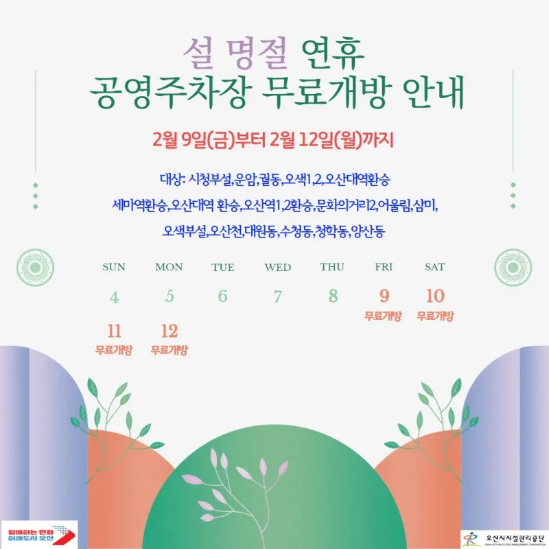 ▶ 무료개방 대상 : 시청부설, 운암, 궐동, 오색12, 오산대역환승, 세마역환승, 오산역12, 문화의거리, 어울림, 삼미, 오색부설, 오산천, 대원동, 수청동, 청학동, 양산동