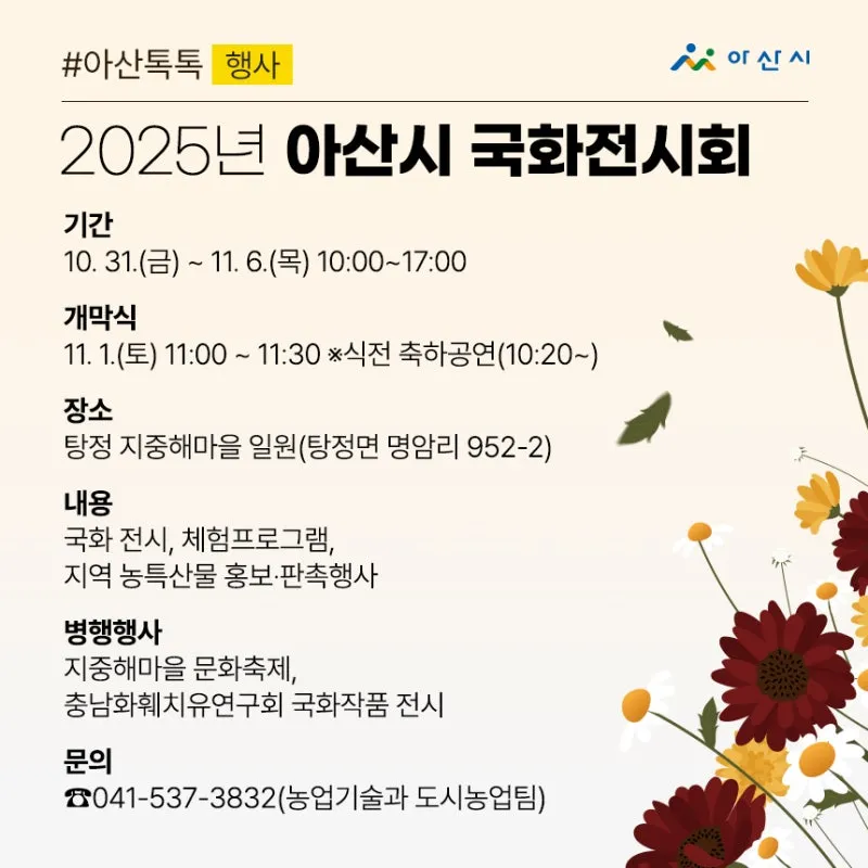 이번 주 ‘아산톡톡’에서는 화려한 국화 전시와 자연 속 힐링 행사,