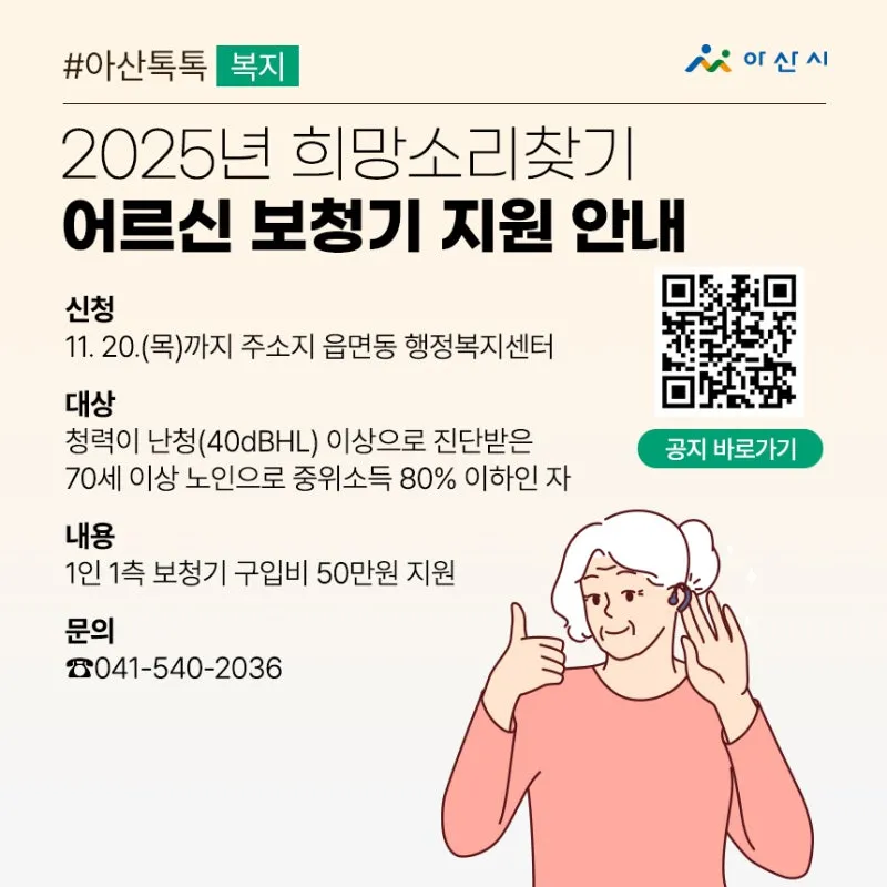 2025 년 「 희망소리찾기 」 어르신 보청기 지원 안내 1. 신청기간 : 2025 년 11 월 20 일까지 2. 사 업 량 : 17 명 3. 지원대상 : 청력이 난청 (40dBHL) 이상으로 진단받은 70 세 이상 노인으로 중위소득 80% 이하인 자 ※ 제외대상 : 청각등록장애인 , 국민건강보험법 , 의료급여법 , 기타 복지사업 보청기 구입비를 지원받은 자 4. 지원내용 : 1 인 1 측 보청기 구입비 50 만원 지원 5. 신청방법 : 주소지 읍면동 행정복지센터 방문신청 6. 신청문의 : 주소지 읍면동 행정복지센터 또는 아산시 경...