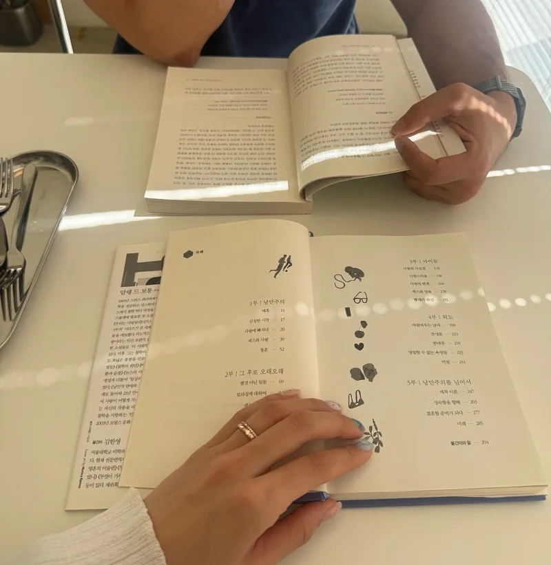 저희가 선택한 자리는 채광이 잘 들어오는 창가 쪽 테이블입니다. 커피를 마시며 편안하게 책을 읽을 수 있는 자리라 선택하게 되었습니다. 저에겐 여유가 느껴지고 힐링 되는 공간에서 책을 읽는 것이 소소한 행복으로 다가옵니다.