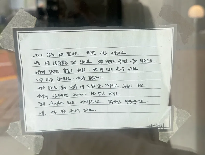 카페 이름인 ‘사선’에 관련된 사장님의 글도 보실 수 있습니다. “잠시 쉬어갈까 봐요. 어디쯤인가요 마주치면 반갑겠어요.” “네, 나는 지금 사선에 있어요.” 등 짧은 글이었지만 인상적인 글이었습니다. 카페에 방문하신다면 한번씩 읽어보셔도 좋을 것 같습니다.