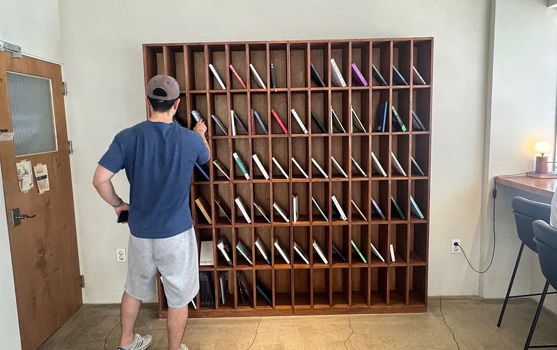 그리고 한쪽 벽면에는 책이 꽂아있는 책장도 있습니다. 사장님이 책을 많이 좋아하시는 게 느껴질 정도로 책 종류도 다양하게 많이 놓여 있습니다. 책을 좋아한다면, 사선 카페에 머물러 잠시 커피와 함께 책을 읽으시는 걸 추천드립니다.