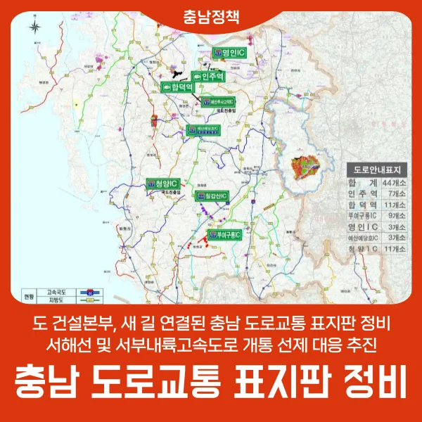 충남도가 지난달 서해선 복선전철 개통에 이어 이달 서부내륙고속도로 준공 등 새로운 길이 잇따라 연결됨에 따라 도로교통안내 표지판 일제 정비에 나선다.