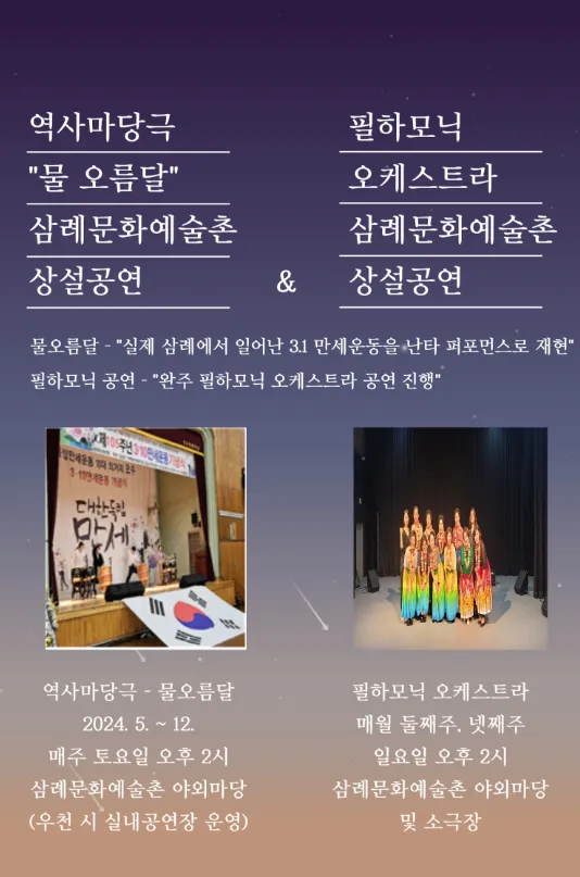 이 외에도 매주 토요일 2시 삼례문화예술촌 야외마당에서 역사마당극 ‘물 오름달’이 진행됩니다.