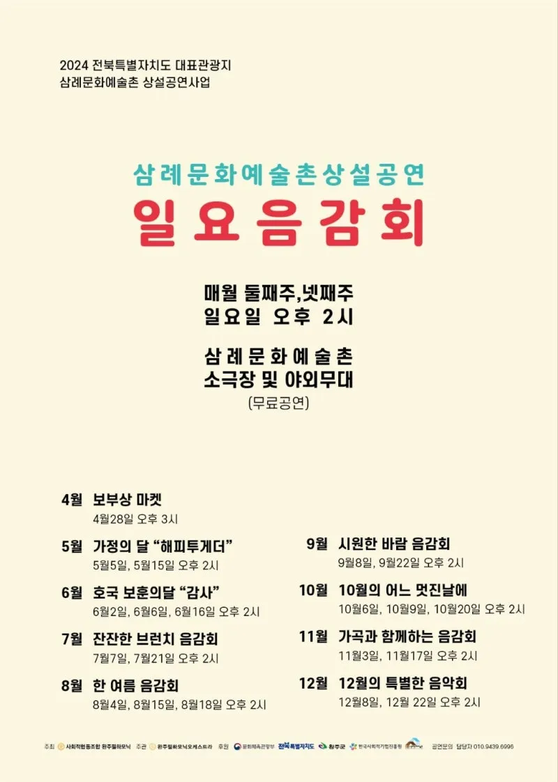 삼례문화예술촌 상설공연은 2024년 12월까지 공연될 예정입니다.