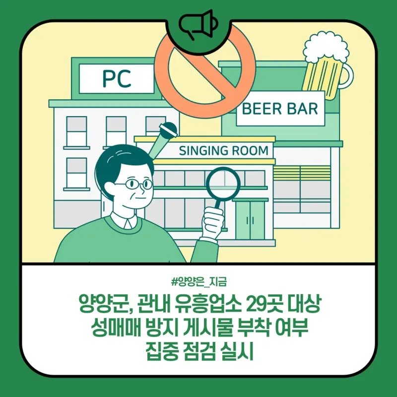 양양군이 오는 11월 24일(월)부터 12월 5일(금)까지 관내 등록된 유흥업소 29곳을 대상으로 성매매 방지 게시물 부착 여부와 적정성을 점검한다고 밝혔습니다.
