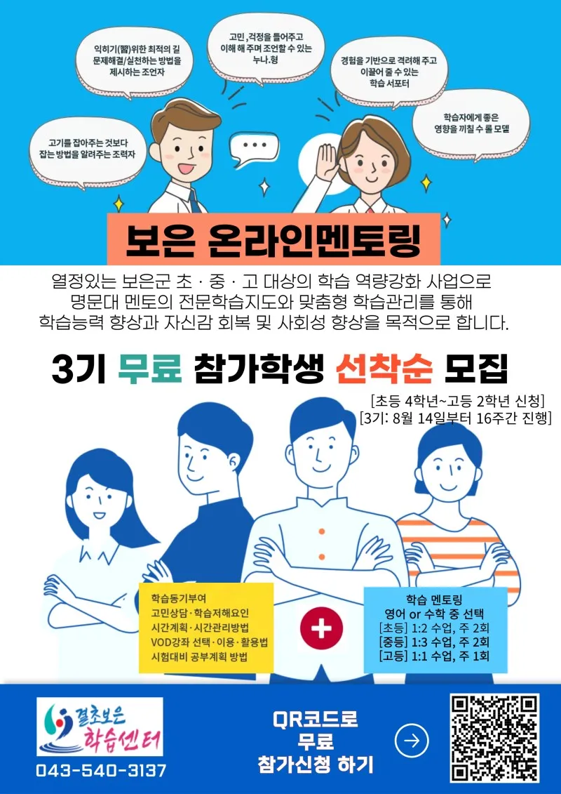 - (고등학생) 학생으로 구성된 멘티와 1:1매칭, 보은군 온라인 학습 플랫폼