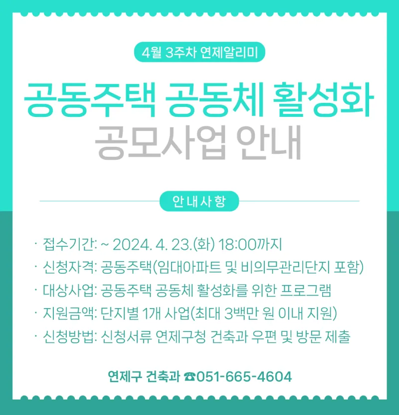 2024년 공동주택 공동체 활성화 공모사업 연제구 건축과 ☎051-665-4604 |