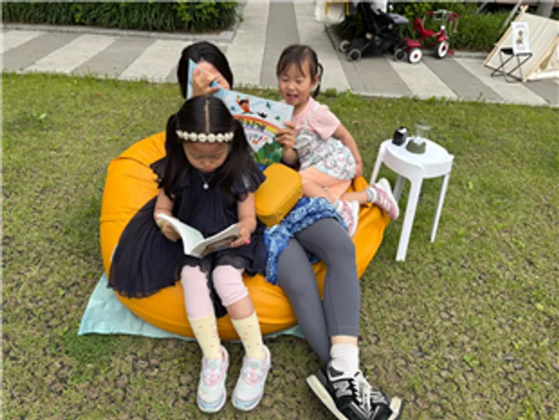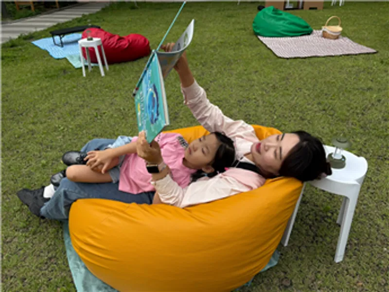아이와 부모, 가족 모두가 함께 책 읽는 모습이 정말 너무 아름답네요. 빈백에 누워 책도 보다, 가끔 하늘도 보며 힐링도 하고, 시간이 잠시 멈추어 있는 듯한 평화로운 순간이었었어요.