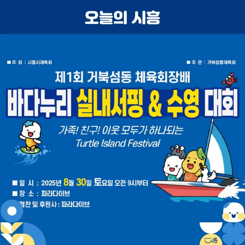 시흥시 거북섬동 체육회가 오는 8월 30일 오전 9시부터 오후 6시까지 거북섬 파라다이브(거북섬중앙로 1)에서 ‘제1회 거북섬동 체육회장배 실내서핑 & 수영대회’를 개최합니다.
