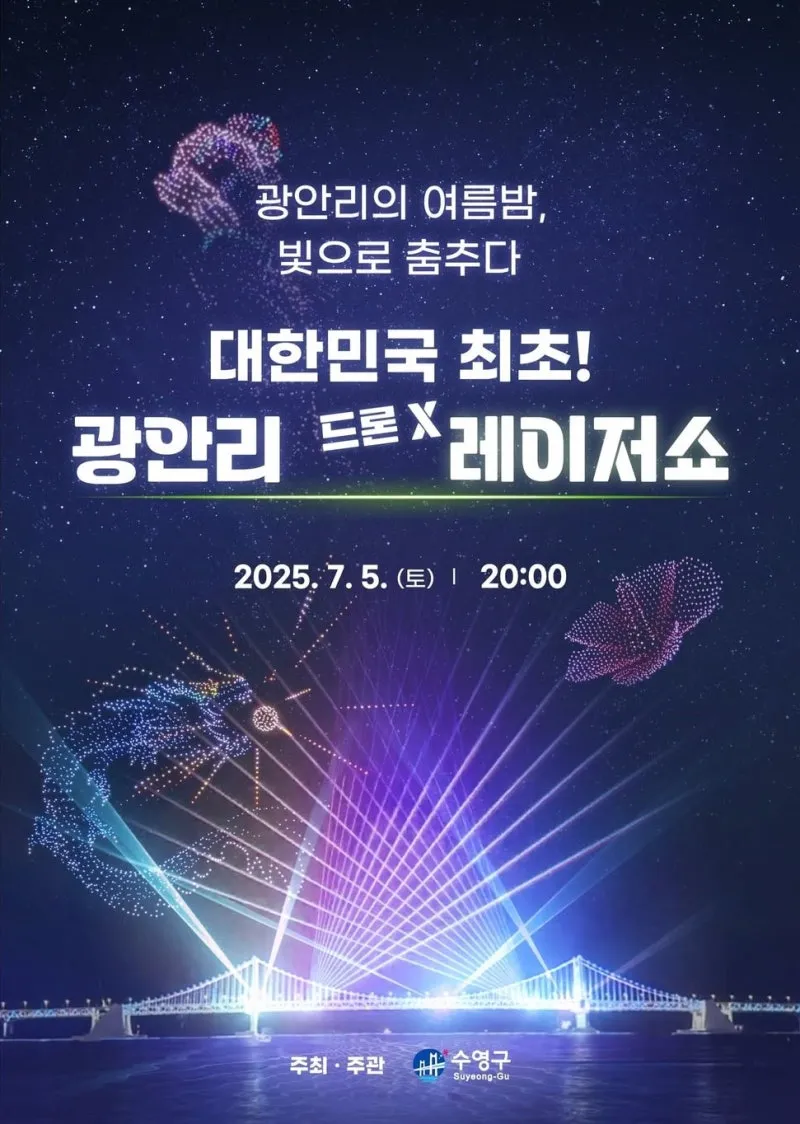 📅 광안리 M 드론 X 레이저쇼 일시: 2025년 7월 5일(토) 저녁 8시 (1회 공연) 장소: 광안리 해변 관람료: 무료 |