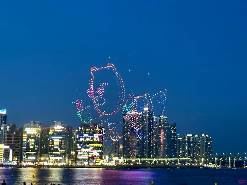 이번 드론쇼는 ‘프렌즈투어 in 광안리’를 주제로 카카오프렌즈 캐릭터인 라이언과 춘식이가 관람객들에게 인사를 건넸습니다.