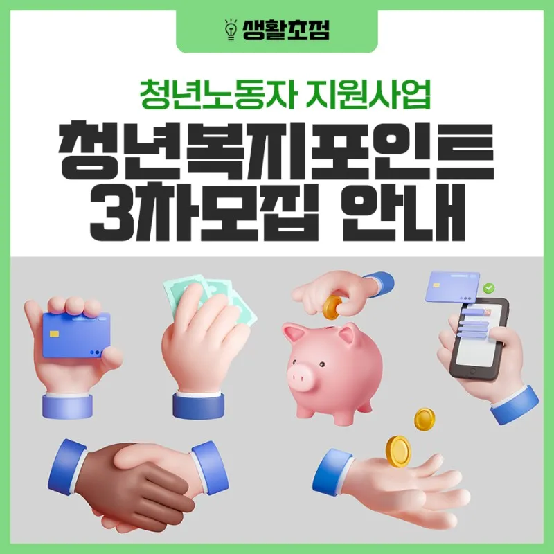 휴지, 샴푸, 세제, 쓰레기봉투 등... 월급을 쪼개서 살다 보면 생필품으로 드는 돈을 결코 무시할 수 없는데요. 청년들의 어려운 살림을 조금이나마 지원하기 위해 만들어진 포인트제도가 있다는 사실 알고 계셨나요? 1년간 최대 120만원의 복지 포인트를 제공하는 경기도 청년 복지포인트가 3차 모집을 실시합니다! 해당 포인트로는 전용 온라인몰에서 생필품 등을 구매할 수 있다고 하니 살림에 보탤수 있는 좋은 기회 놓치지 마세요!(⑅˃◡˂⑅)