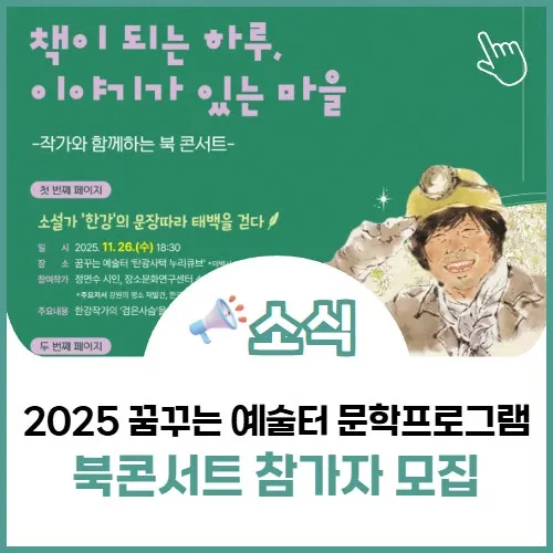 1. <소설가 ‘한강’의 문장따라 태백을 걷다> -정연수 작가편 일시 2025. 11. 26.(수) 18:30 장소 꿈꾸는 예술터 ‘탄광사택 누리큐브’ 주요내용 한강작가의 ‘검은사슴’을 중심으로 태백을 바라보기 2. <태백을 스토리텔링하다> -홍종의 동화작가편 일시 2025. 11. 29.(토) 09:30 장소 꿈꾸는 예술터 ‘탄광사택 누리큐브’ 주요내용 태백시 명예시민 홍종의 동화작가와 함께하는 북콘서트 & 스토리텔링 대상 30명 선착순 모집 *가족참여가능, 프로그램 선택 가능 참여방법: 구글링크 신청 및 전화접수(070-4279...