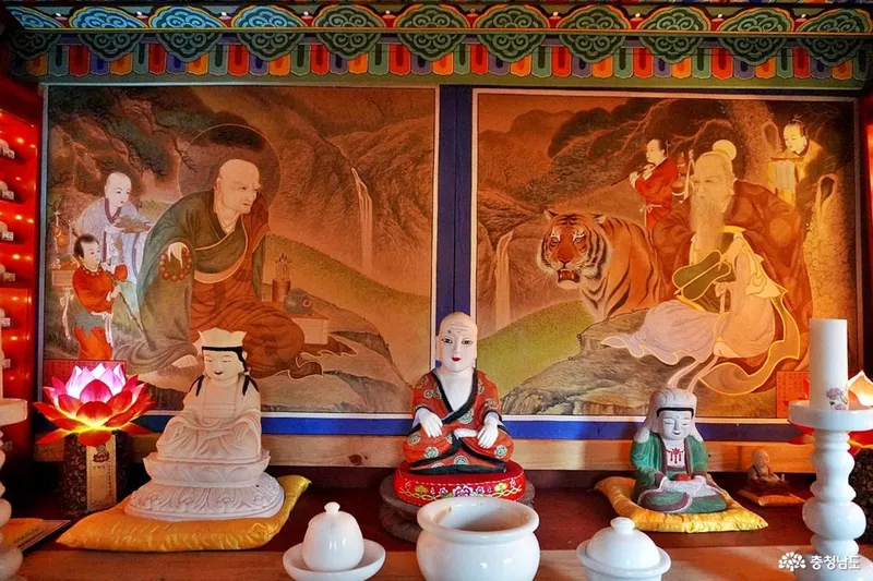 건물은 총 3층 구조로 템플스테이용 건물이 아래쪽에 인법당과 요사채가 중간, 산신각이 가장 상단입니다. 100여 년을 넘었을 것 같은 고목과 울창한 사이로 자리 잡은 앞면, 옆면 각 1칸 규모의 소박한 형태입니다. 깊은 산중에 위치한 사찰은 산신각의 기운이 남다르게 느껴지네요. 산신과 호랑이의 위엄이 크게 다가왔습니다.