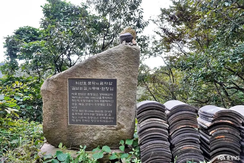 가파른 언덕길 숨을 헐떡이며 오르노라니 최인호 문학의 금자탑이 나타납니다. 연암산 천장사는 대한불교조계종 수덕사의 말사로 633년 백제 무왕 때 담화대사가 수도하기 위해 창건하였다 전해집니다. 하지만 담화가 누구인지는 정확하지 않으며 근대 한국불교에서 선종을 중흥한 경허대사가 수도하고 만공대사가 불법을 계승한 사찰로 널리 알려졌습니다.