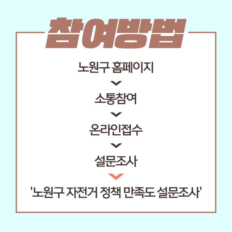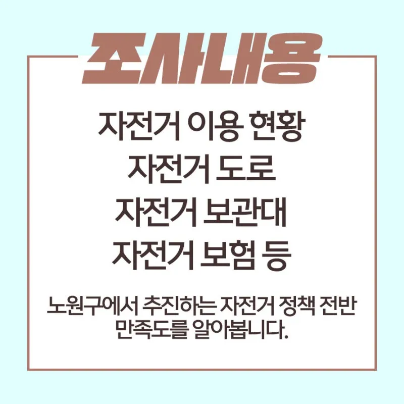 주민 여러분에게 더 만족스러운 자전거 정책을 제공하기 위한 노원구의 노력에 적극적인 설문조사 참여로 응답해 주시길 기대하고 있습니다.