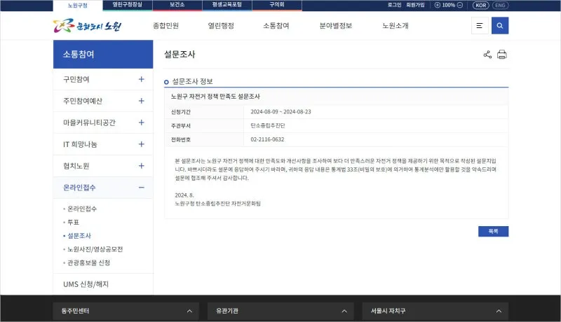 노원구 홈페이지 > 소통참여 > 온라인접수 > 설문조사 '노원구 자전거 정책 만족도 설문조사'