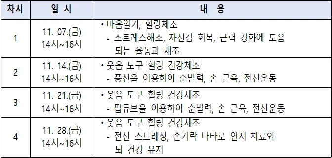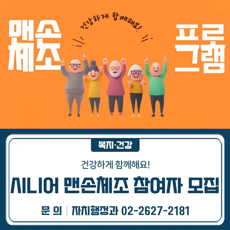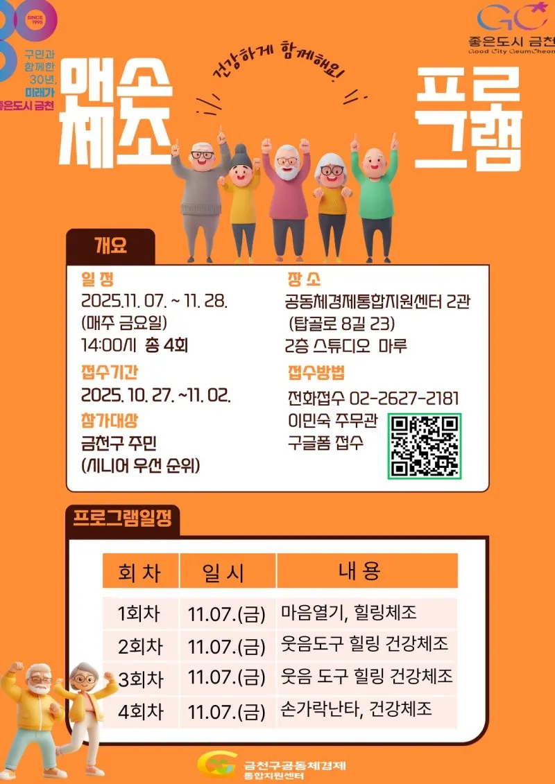 ✨2025년 시니어 맨손체조에 초대합니다! 👀 * 이 교육은 공동체경제통합지원센터 공간 활성화를 위해 기획되었습니다. 🔹 대상: 금천구 주민(시니어 우선순위)15명 🔹 장소: 서울시 금천구 탑골로8길23(시흥2동) 공동체경제통합지원센터 2층 스튜디오 마루 🔹 일정: 2025년 11월 07일, 14일, 21일, 28일 매주 금요일 오후 2시 ~ 3시 30분 (총 4회) - 재료비 및 참가비 없음 * 강사: 지현숙 강사(맨손 도구 체조 및 웃음 치료 강사) 🔹 주최/주관: 금천구청, 금천구공동체경제통합지원센터 문의: 02-26...