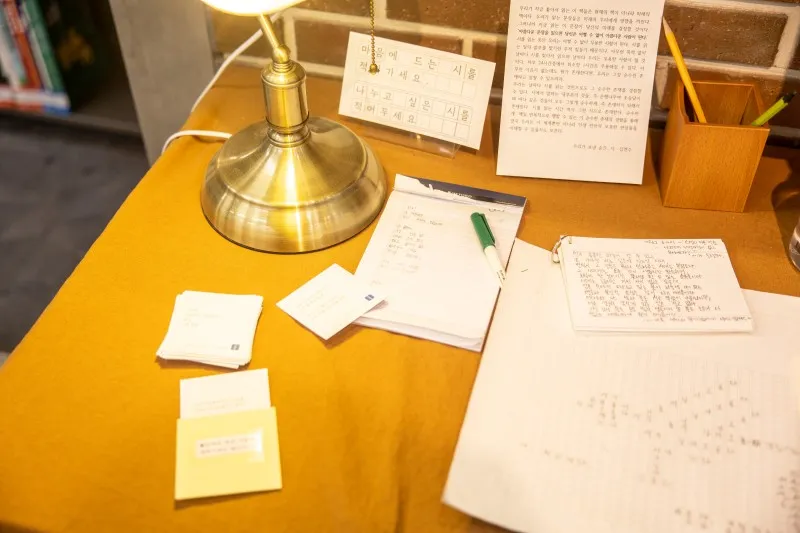 또 중앙도서관에는 재미있는 코너가 있었습니다. 직접 시를 작문하여 전시를 하거나 가져가고 공유할 수 있는 좌석이 있더라고요. 빠르게 디지털, 비대면화 되어가는 세상에서 사각사각하는 연필 소리와 쓱쓱 지우는 지우개 소리가 나는 멋진 곳이었습니다. 꼭 한번 체험해 보시길 바랍니다.