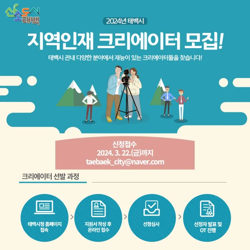 웰로1년 전2024 지역인재 크리에이터 모집 2024 지역인재 크리에이터 모집 모집기간 2024년 3월 22일 (금)까지 모집대상 관내 크리에이터 분야의 관심있는자 (유튜브 영상 분야·사진 분야·블로그 분야) 모집인원 9명 지원방법 태백시청 홈페이지 지원서 다운로드, 작성 후 메일전송 taebaek_city@naver.com 활동기간 2024년 4월 1일 (월) ~ 2024년 11월 30일 (토) 활동내용 유튜브 분야: 매월 직접 제작한 영상 1편 이상 제출 사진 분야: 매월 3점 이상 사진 제출 블로그 분야: 매월 직접 작성한 게시글 1개 이상 활동혜택 워크숍 진행 시 관련 교육 지원 활동비 지급 매월 20만 원 콘텐츠 제작 지원(10만 원, 1회) 크리에이터 신분증 제공 태백시청 홈페이지 공고 ↓↓↓↓↓↓↓↓↓↓↓↓↓↓↓↓ https://www.taebaek.go.kr/www/selectBbsNttView.do?key=352&bbsNo=25&nttNo=152975&searchCtgry=&searchCnd=all&searchKrwd=&pageIndex=5&integrDeptCode= 이 블로그 알림 카테고리 글 이전 이전 다음 다음 {"title":"2024 지역인재 크리에이터 모집","source":"https://blog.naver.com/taebaek_city/223387024571","blogName":"태백시 공..","blogId":"taebaek_city","domainIdOrBlogId":"taebaek_city","logNo":223387024571,"smartEditorVersion":4,"meDisplay":true,"lineDisplay":true,"outsideDisplay":true,"cafeDisplay":true,"blogDisplay":true} #태백#크리에이터#유튜브#블로그출처:https://blog.naver.com/taebaek_city스크랩