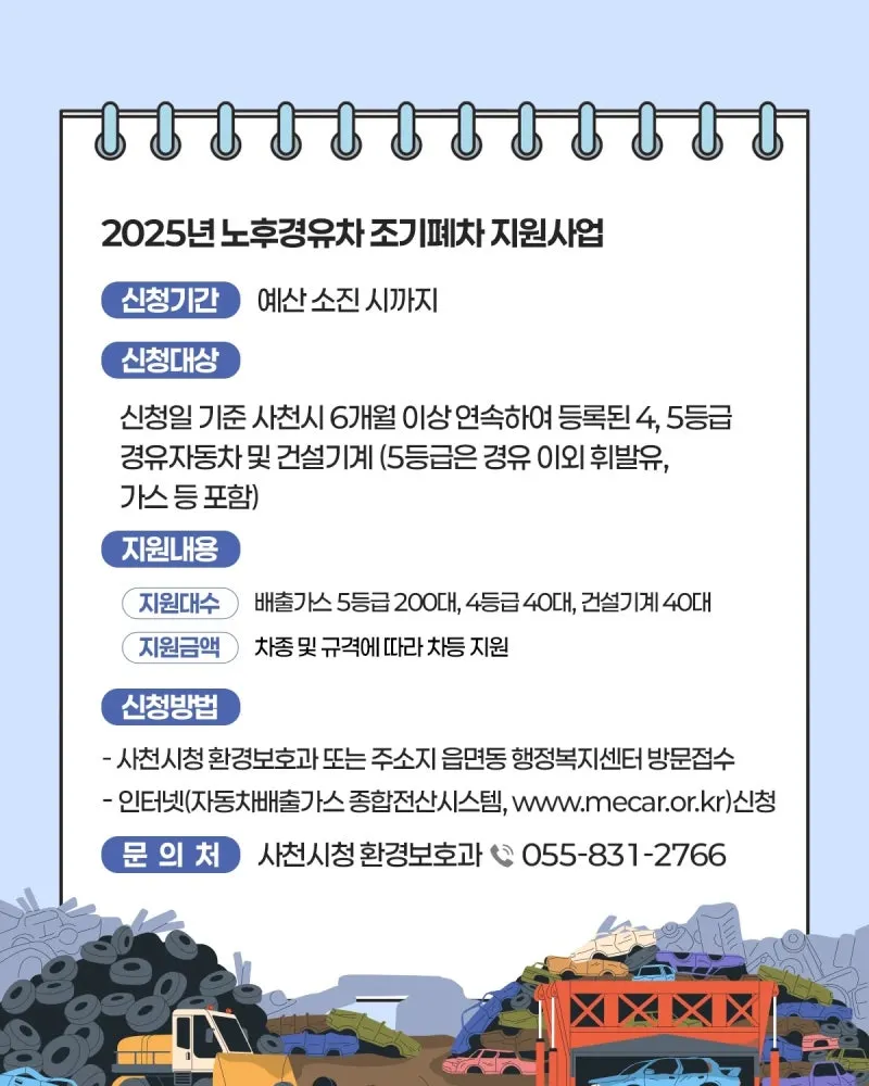 ✔ 신청대상: 신청일 기준 사천시 6개월 이상 연속하여 등록된 4, 5등급 경유자동차 및 건설기계(5등급은 경유 이외 휘발유, 가스 등 포함)