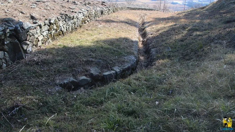 동문지를 지나면 성곽 앞으로 긴 홈이 파여 있는데