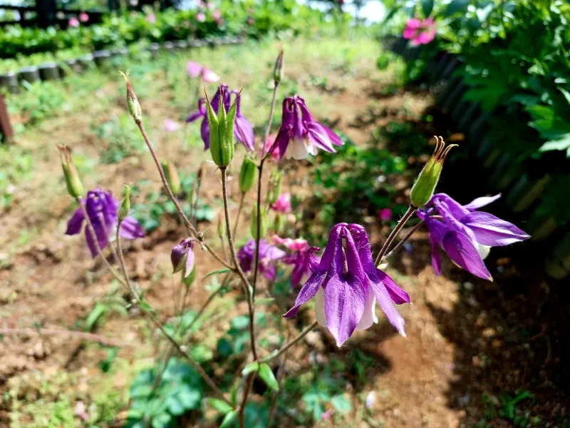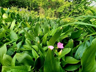 푸른 물결 출렁이는 옥잠화 사이 수줍게 핀 한 송이 메꽃, 고개 숙인 매발톱꽃,