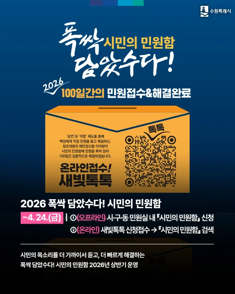 폭싹 담았수다! 시민의 민원함이 올해도 돌아왔습니다! 시민의 목소리를 더 가까이서 듣고, 더 빠르게 해결하기 위해 운영되니