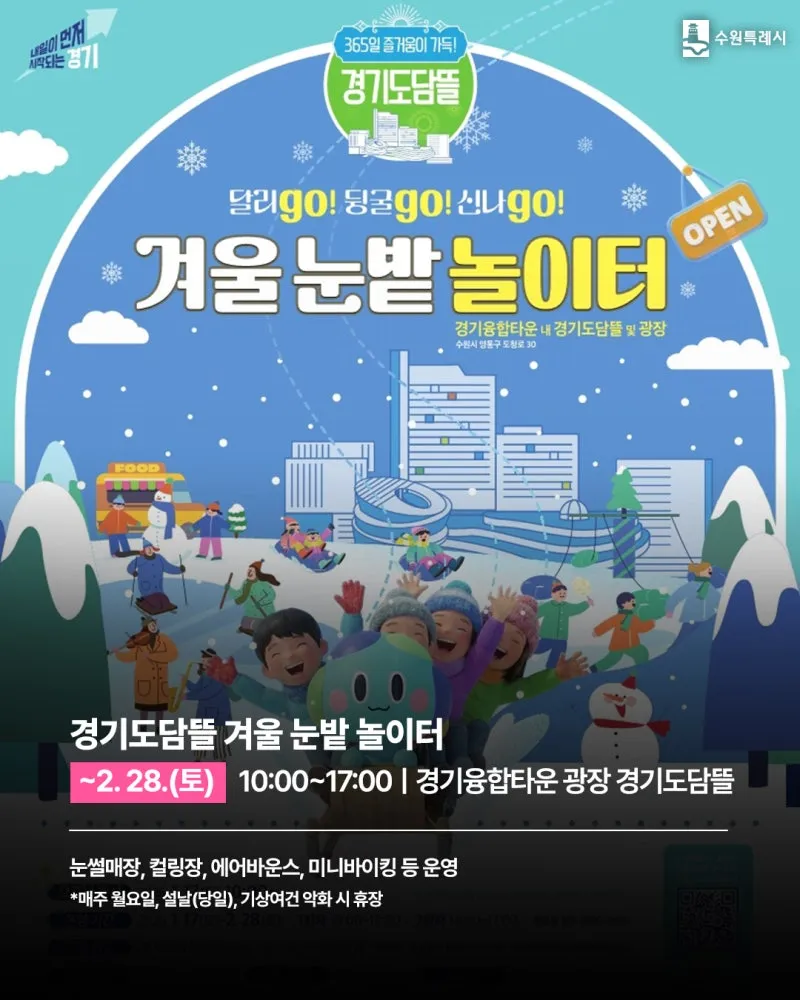 겨울이 기다려지는 이유! 아이와 함께 방문하면 좋은 눈밭놀이터에는 눈썰매와 얼음썰매, 회전썰매를 비롯해 컬링장, 에어바운스, 미니바이킹 등이 있습니다. 온 가족이 즐거운 겨울 방학 추억을 만들어 보세요.