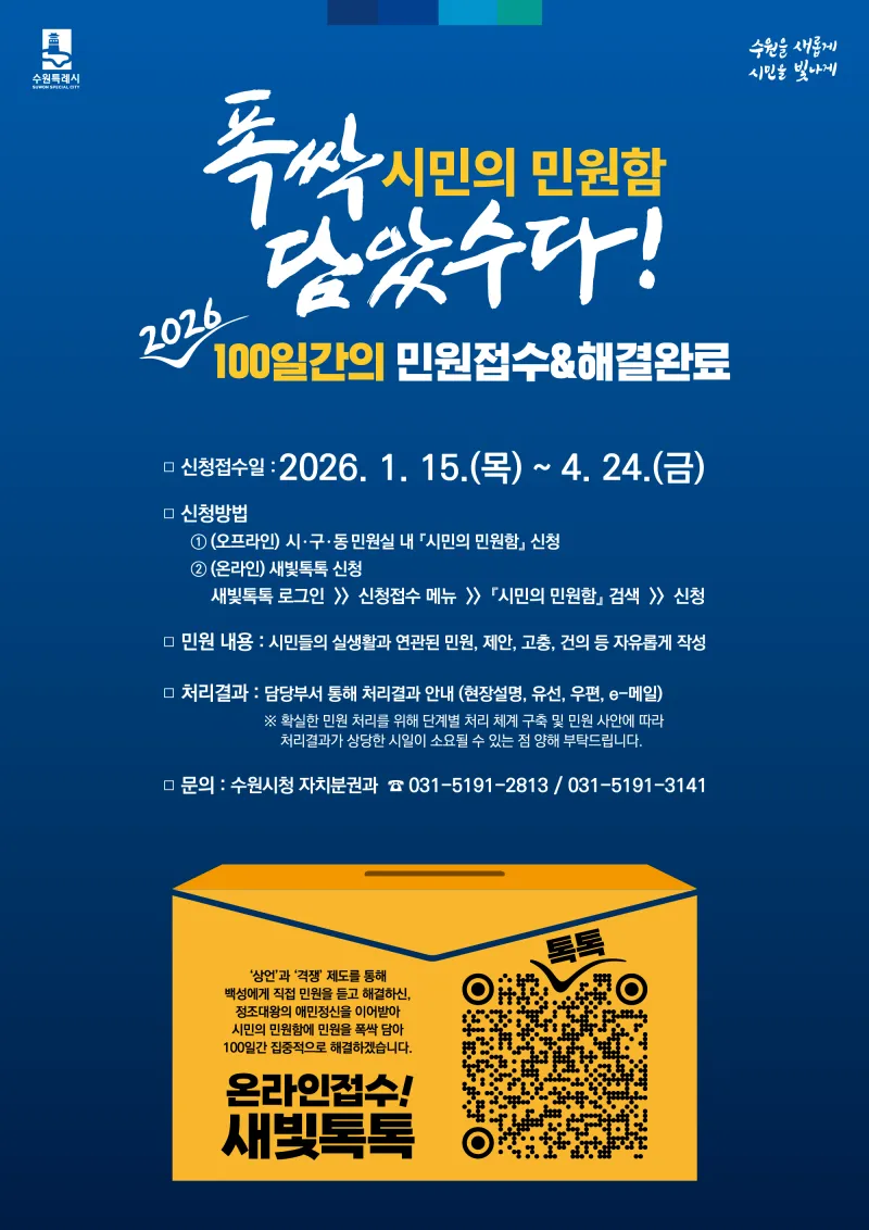수원시에서 거주·활동하는 시민 누구나 이용해 보시기 바랍니다. 시민들의 실생활과 연관된 민원, 제안, 고충, 건의 등 자유롭게 들려 주세요.