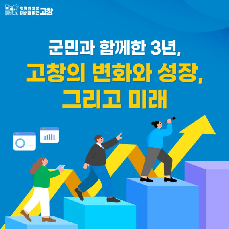 고창군은 민선8기 3주년을 보내면서, '고창의 변화', '고창의 성장', '고창의 미래' 세 가지를 주제로 그동안의 걸어온 발자취를 돌아보고 앞으로의 비전을 알아보는 시간을 마련했습니다.