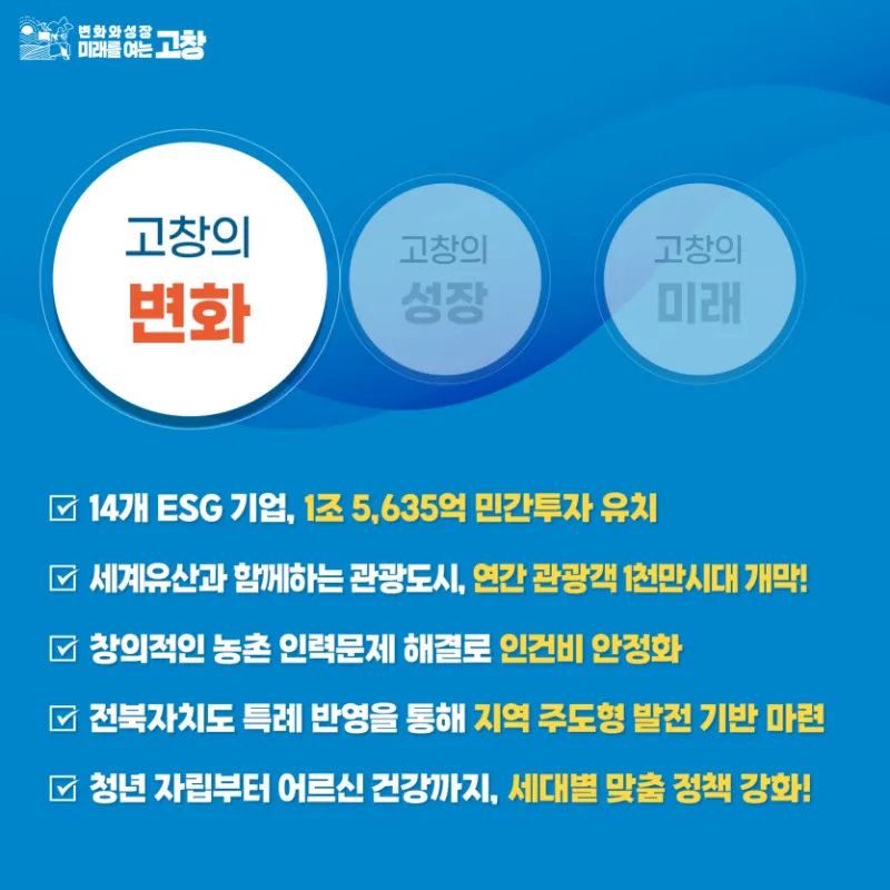 고창의 변화를 만들어 온 과정에 군민 여러분의 참여와 관심이 함께 했습니다. 앞으로도 이러한 고창의 변화는 계속 이어질 것입니다.