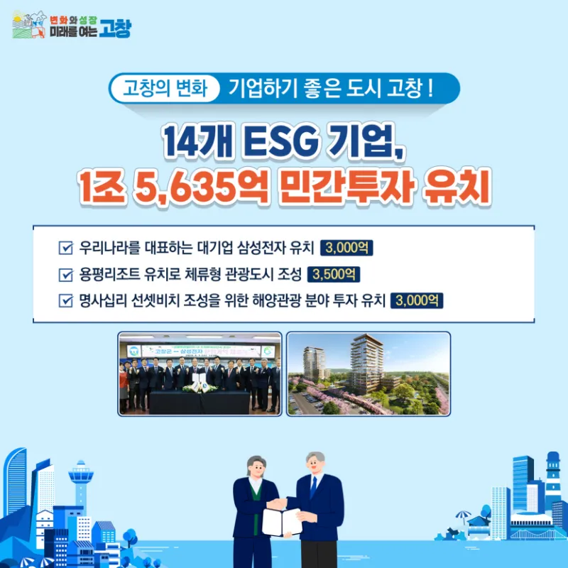 고창군에 삼성전자(3,000억), 용평리조트(3,500억), LIG시스템 등 중견기업 4개사(3,000억), JNICT·SOTO(3,000억) 등 총 14개 기업으로부터 약 1조6천억원 규모의 투자가 이어지고 있습니다. 특히 삼성전자 입주로 인해 앞으로 계열사와 협력업체들의 잇따른 참여가 기대되며, 용평리조트와 함께 심원 염전부지에는 호텔·리조트·레저시설을 아우르는 고창 종합테마파크가 들어설 예정입니다. 여기에 명사십리 해양관광지 조성 등 지역 자원을 살린 관광 개발도 속도를 내면서, 고창은 더 이상 스쳐가는 곳이 아닌 머무는 체류형 관광도시로 도약하고 있습니다.