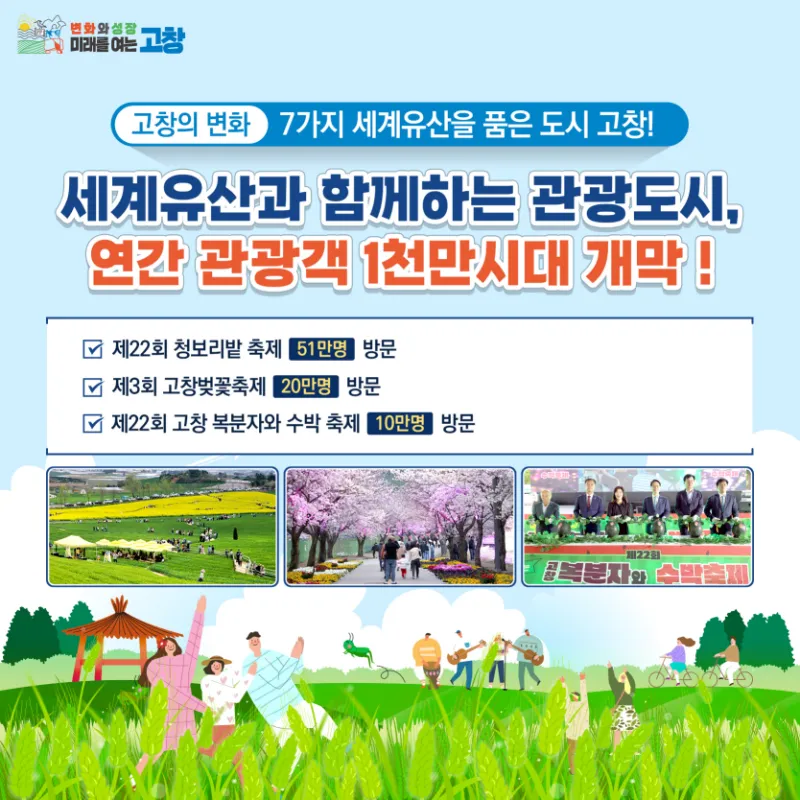 고창군은 세계유산도시의 자부심을 안고, 마침내 관광객 1천만 시대를 열었습니다. 유네스코가 인정한 7개의 세계적인 보물을 품은 고창은 "2023 고창 방문의 해"의 대성공을 시작으로 벚꽃축제, 청보리밭 축제, 모양성제 등 다양한 축제들이 큰 사랑을 받으며 고창을 찾는 발걸음을 한층 더 늘려주고 있습니다.