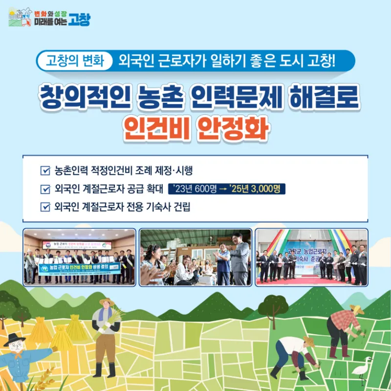 고창군은 전국 최초로 '농촌인력 적정인건비 조례'를 마련해 안정적인 임금 체계를 만들고, 농업인 근로자 기숙사 건립으로 근로자들이 일할 수 있는 환경을 개선했습니다. 또한, 외국인 계절근로자를 위한 관리센터를 설립하고, 무료 건강검진을 시행하는 등 안심하고 일할 수 있는 여건을 갖추었습니다. 이러한 노력이 이어지며, 외국인 근로자 공급 확대와 인건비 안정이라는 의미 있는 변화로 연결되고 있습니다.