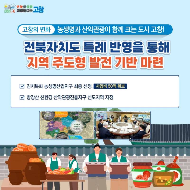 고창군이 '전북특별자치도' 출범과 함께 또 한 번의 새로운 기회를 맞이하고 있습니다. '전북특별법 특례'를 통해 김치특화 농생명산업지구로 선정되어 50억을 확보했고, 방장산이 '친환경 산악관광진흥지구 선도지역'으로 지정되면서 민간투자와 규제 완화의 길이 열렸습니다. 이제 고창군은 농생명 산업과 산악관광을 두 축으로 삼아 지역이 직접 주도하는 새로운 발전의 길을 힘차게 열어가고 있습니다.