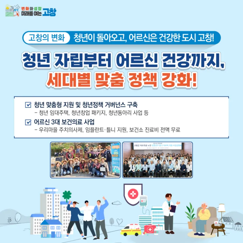 고창군이 청년은 돌아오고, 어르신은 건강한 도시로 변하고 있습니다. 청년들에게는 임대주택과 창업 지원, 그리고 스마트팜 단지를 마련해 농업과 지역에 뿌리내릴 든든한 기반을 만들어 주고 있습니다. 또한 어르신들에게는 찾아가는 우리마을 주치의사제, 임플란트·틀니 지원, 65세 이상 보건소 진료비 전액 무료 등 '3대 보건의료 사업'을 통해 건강하고 행복한 노후를 지켜드리고 있습니다.