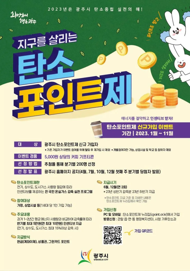 광주시는 2023년 1월부터 11월까지 탄소포인트제 신규 가입자를 대상으로 분기별 추첨을 통해 200명을 선정해 5,000월 상당의 커피 기프트콘을 제공하는 이벤트를 진행 중에 있습니다.