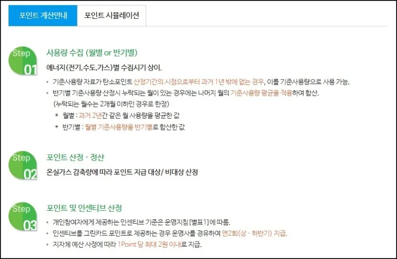 <에너지별 사용량 수집 → 온실가스 감축량에 따라 포인트 지급 대상 산정 → 포인트 및 인센티브 산정> 순으로 진행됩니다.