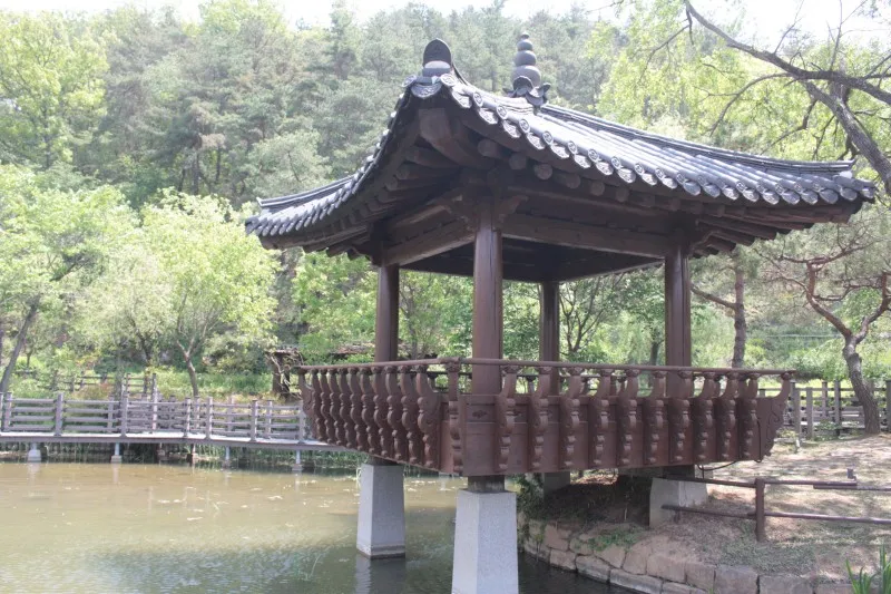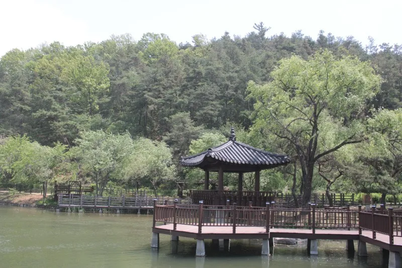 수상데크로에서 바라본 우륵정이에요. 뒤로는 야산이 있고 나무들은 초록이 가득해서 경치가 좋아요.