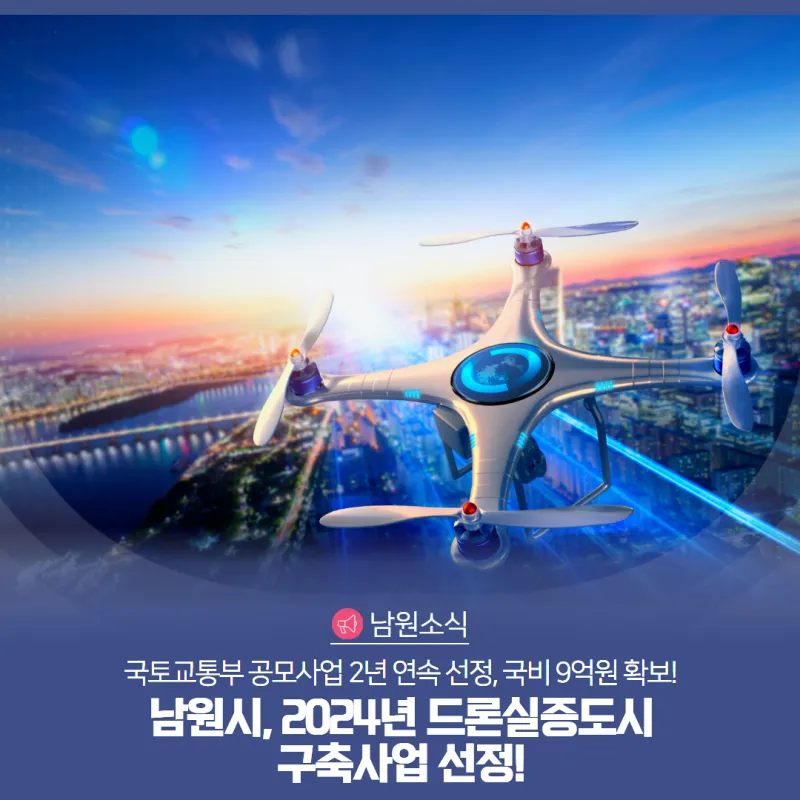남원시가 2년 연속으로 국토교통부 공모사업인 '2024년 드론 실증도시 구축사업'에 최종 선정돼 국비 9억원을 확보했습니다!
