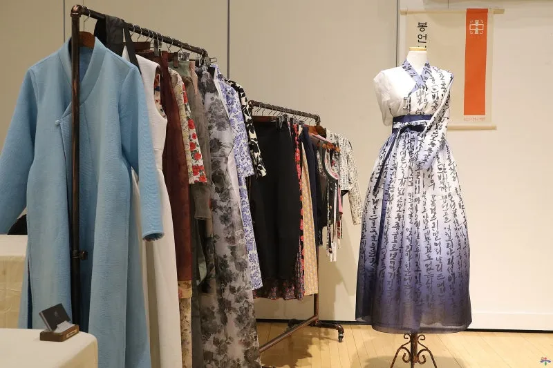 한글이 새겨진 철릭 한복은 한국의 미가 온전히 드러남과 동시에, MZ 세대도 환호할 만한 트렌디한 스타일링을 하고 있습니다.