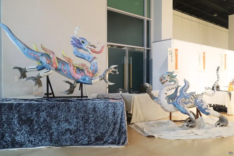 전시실 입구에 위치하여 가장 시선이 꽂혔던 커다란 용 모양 조형물은 조명이 켜지는 종이등이었습니다.