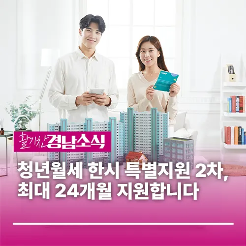 경남도 , 청년에게 주는 든든한 ‘ 주거비의 날개 ’... 청년월세 한시 특별지원 2 차 , 최대 24 개월 지원 - 청년 4,000 여 명 주거비 지원 - 19 세 ~34 세 청년 대상 월 최대 20 만 원 , 최대 24 개월 간 월세 지원 - 2 월 25 일 신청 마감 , 복지로 누리집 또는 시군 읍 · 면 · 동사무소로 신청 경상남도 ( 도지사 박완수 ) 는 올해도 청년들의 주거비 부담 완화를 위해 월 최대 20 만 원씩 월세를 지원하는 ‘ 청년월세 한시 특별 지원 2 차 사업 ’ 을 시행하며 다...