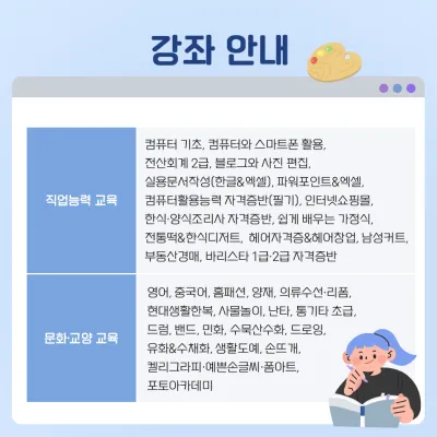 컴퓨터 기초, 컴퓨터와 스마트폰 활용, 블로그와 사진 편집, 전산회계 2급, 실용 문서작성(한글&엑셀), 파워포인트&엑셀, 컴퓨터 활용능력 자격증반(필기), 인터넷 쇼핑몰, 한식·양식조리사 자격증반, 쉽게 배우는 가정식, 전통 떡&한식 디저트, 부동산 경매, 헤어 자격증&헤어 창업, 남성 커트, 바리스타 1급·2급 자격증반 |
