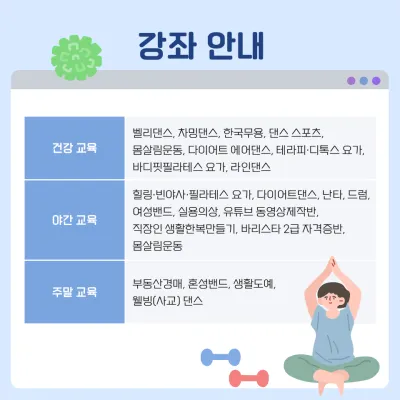힐링·빈야사·필라테스요가, 다이어트 댄스, 난타, 드럼, 여성밴드, 실용 의상, 유튜브 동영상 제작반, 직장인 생활 한복 만들기, 바리스타 2급 자격증반, 몸 살림운동 |