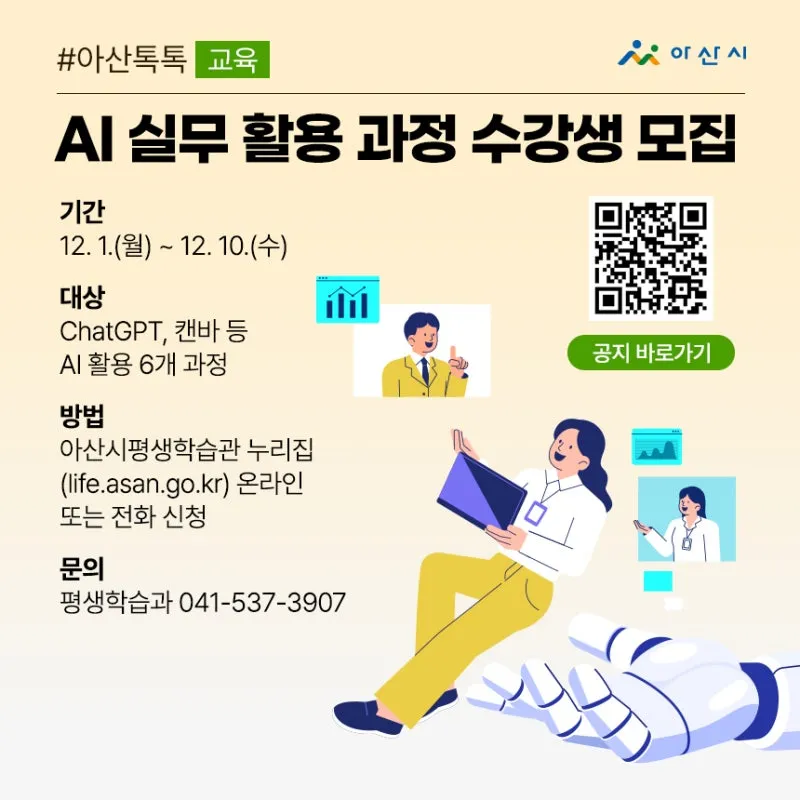 방법 : 아산시평생학습관 누리집(life.asan.go.kr) 온라인 또는 전화 신청